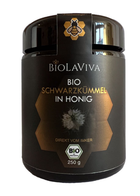 Eine einzigartige Kombination aus biologischem Blütenhonig und gemahlenem biologischem Schwarzkümmel. Der im Schwarzkümmel enthaltene Wirkstoff Thymoquinon gilt als entzündungshemmend und immunstärkend. Anwendung zur Optimierung bei Allergien wie Heuschnupfen oder Hausstauballergie und zur Entgiftung des Körpers: 1 Teelöffel täglich. Das Mironglas (Violettglas) schützt den Honig perfekt vor Lichteinfall.