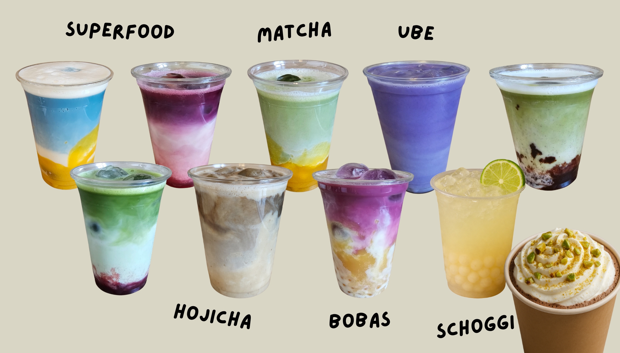 Entdecke feinste Getränke mit Matcha, Ube, Drachenfrucht, Hojicha, Popping Bobas und mehr. Dazu bieten wir eine spezielle Auswahl an heisser Schokolade an.